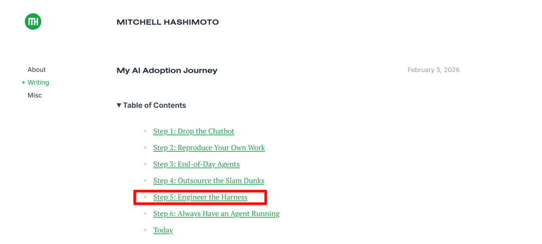 这个词最早来自 Mitchell Hashimoto——HashiCorp 联合创始人、Terraform 的缔造者。他今年 2 月写了篇博客,把自己使用 AI 编程的进化拆成了六个阶段。第五个阶段叫 Engineer the Harness。