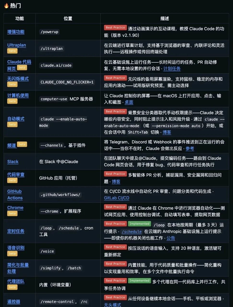项目内置 Hot Features 动态更新表,同步 Claude Code 最新测试版能力,每一项都搭配清晰使用指令+实战场景说明,新手也能轻松拿捏新功能: