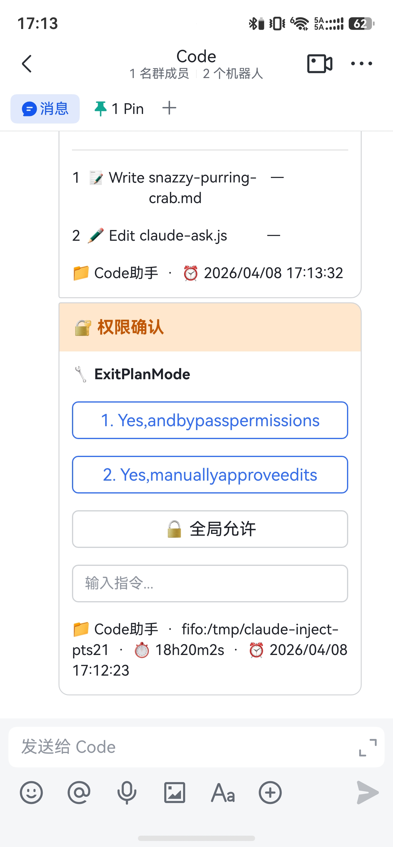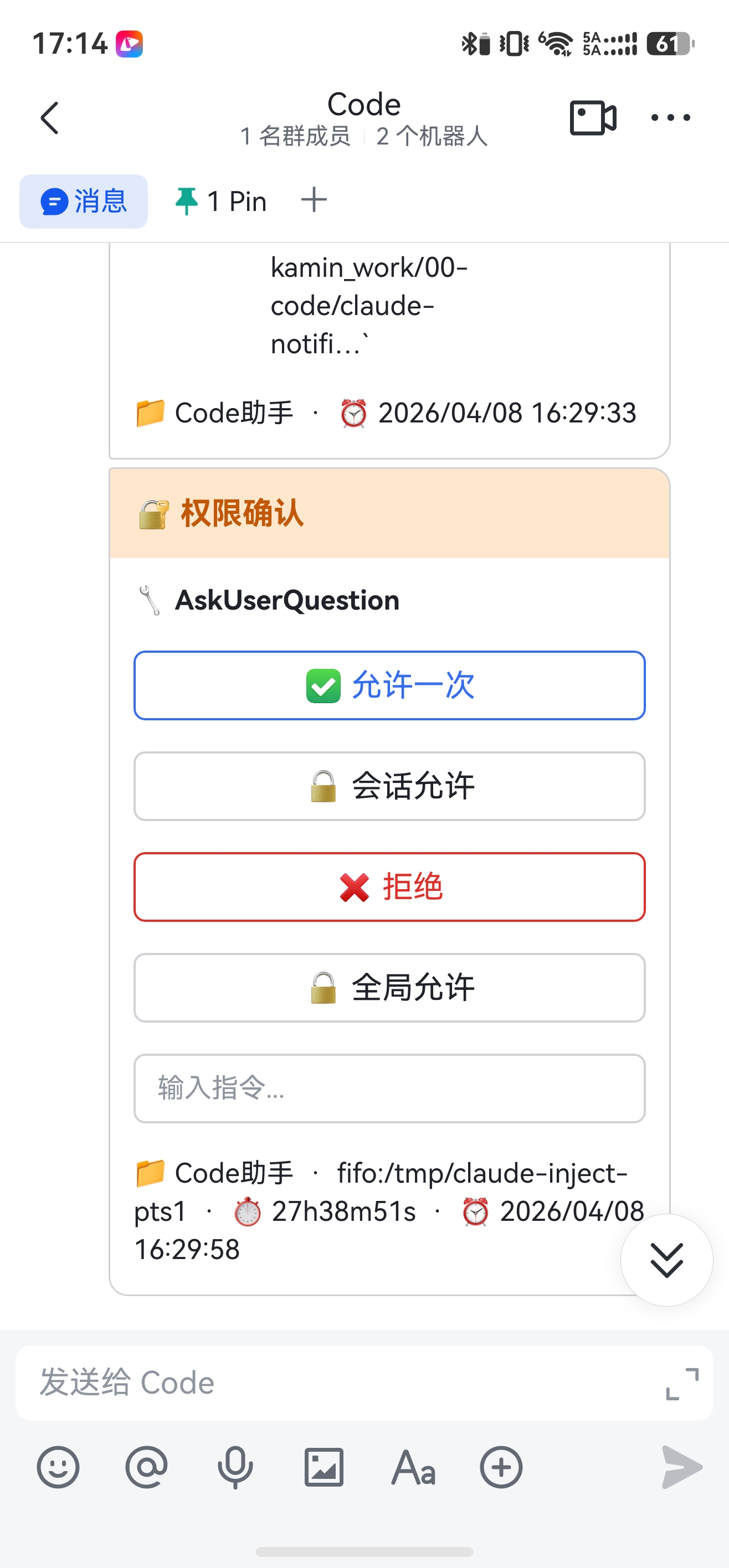 当 Claude Code 需要你批准执行命令,或者 AskUserQuestion 弹出选项时,飞书会收到交互式卡片: