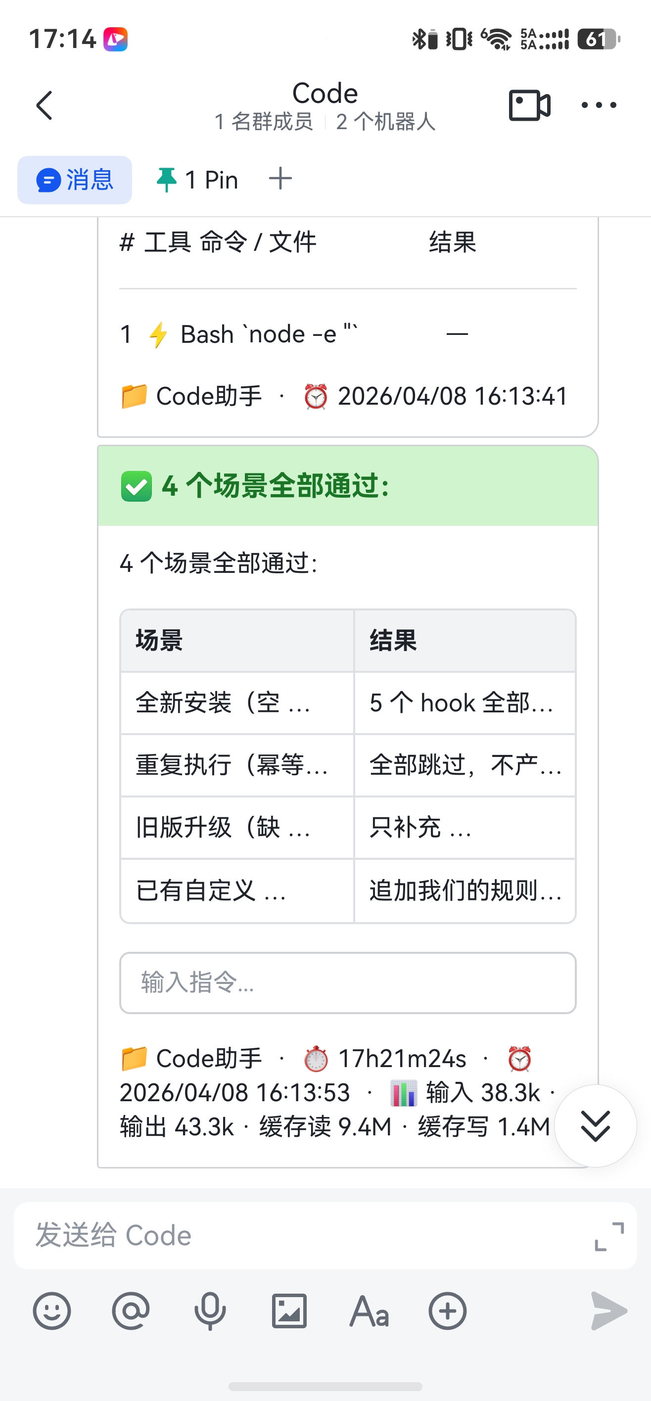 任务跑完后,会收到带改动总结、Token 用量、时长统计的完成卡片,底部还有输入框可以直接续聊: