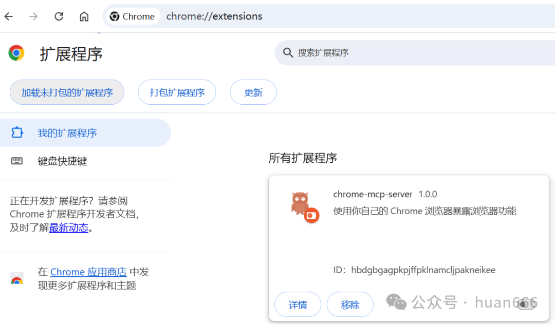 解压mcp-chrome压缩包,点击加载未打包的扩展程序