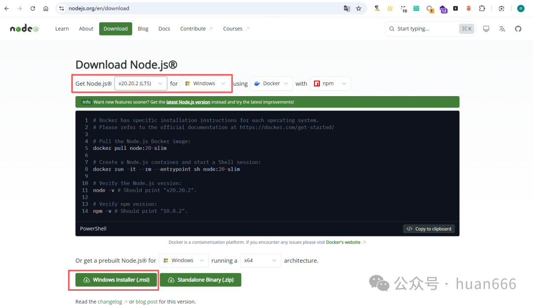 安装nodejs环境,版本大于20+,下载默认安装即可