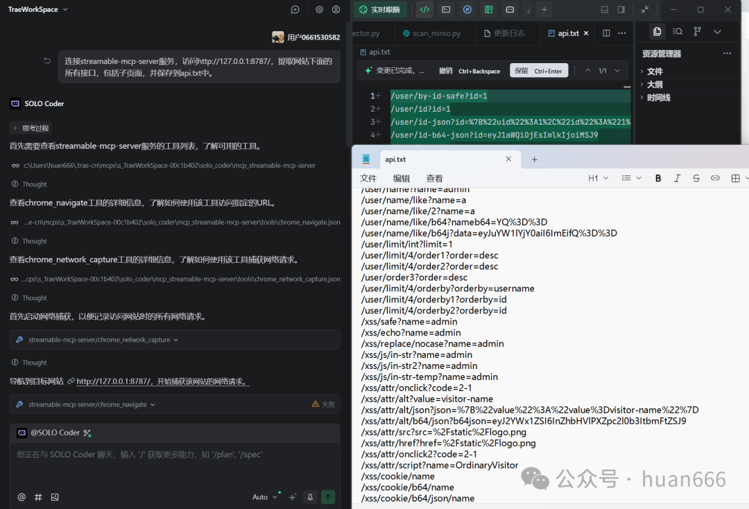 提示词:连接streamable-mcp-server服务,访问http://127.0.0.1:8787/,提取网站下面的所有接口,包括子页面,并保存到api.txt中。