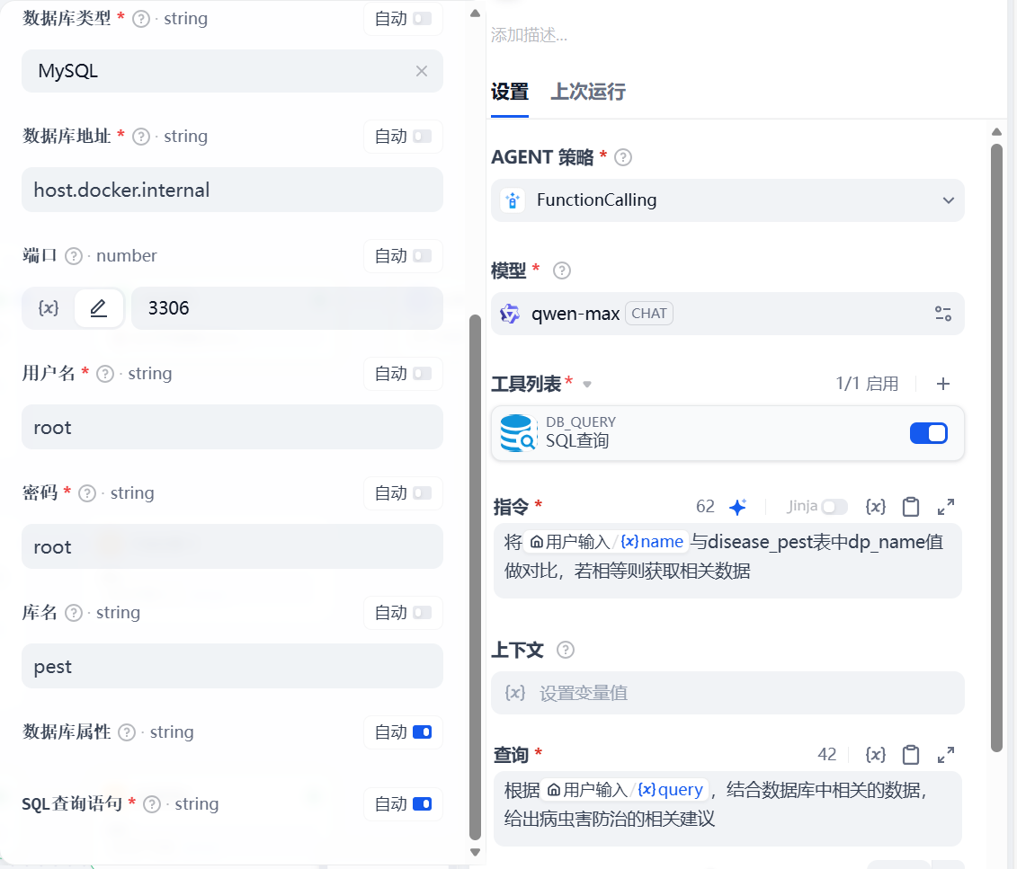 配置MySQL相关参数,填写指令(SQL查询时的指令)和查询(智能体的指令)