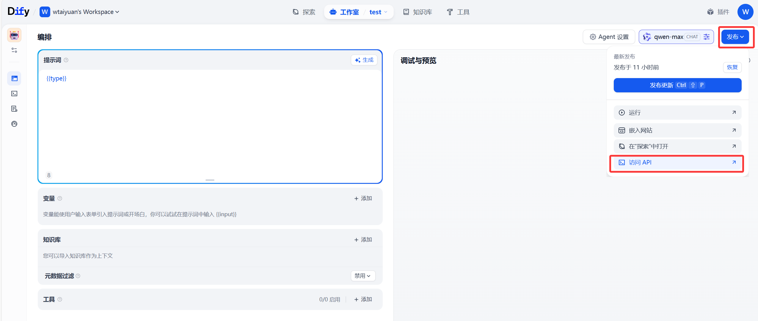 在智能体中选择右上角 发布,选择 访问API