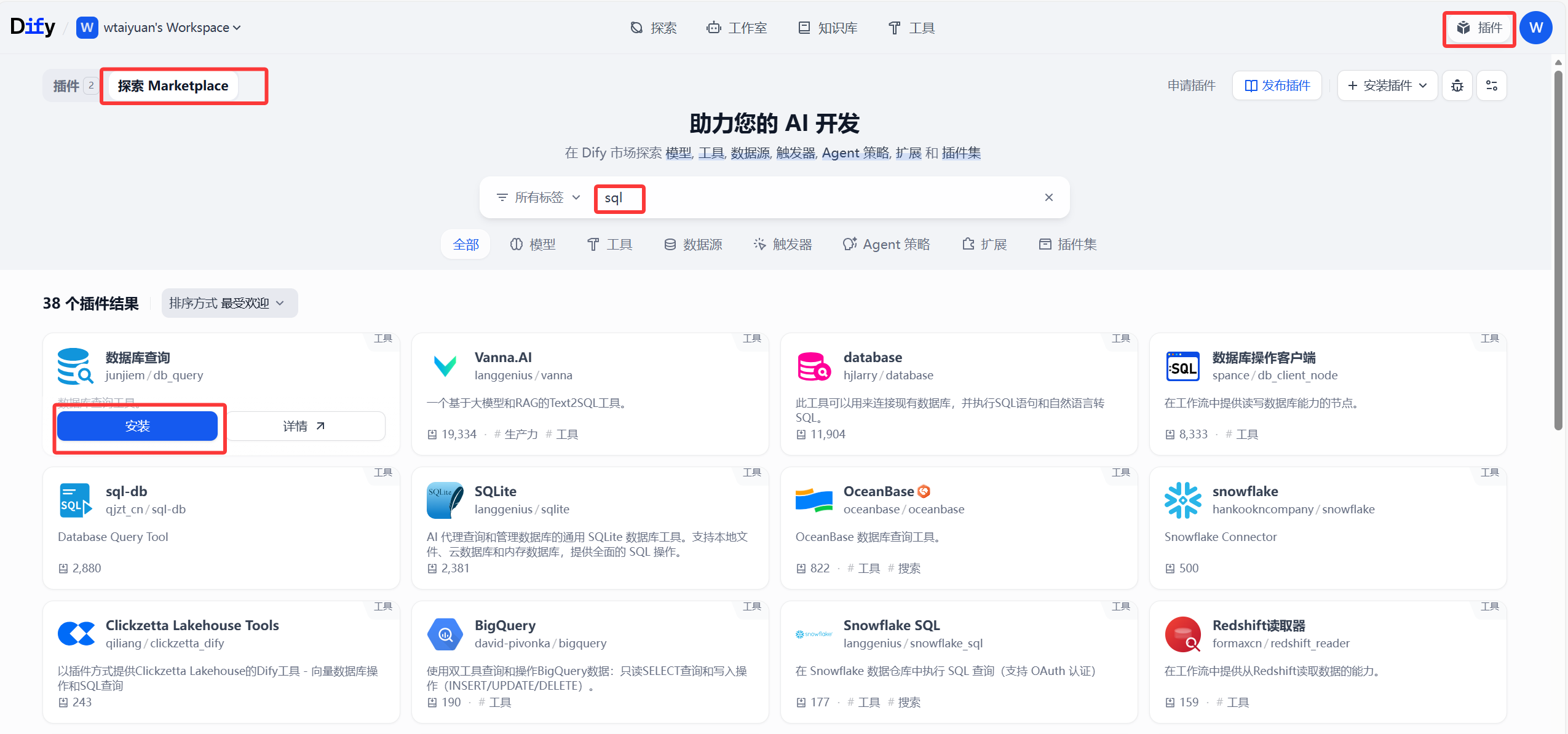 从这里开始,我们需要用到MCP进行数据库内容的调用了,点击右上角 插件 》探索Marketplace 》搜索sql 》安装数据库查询