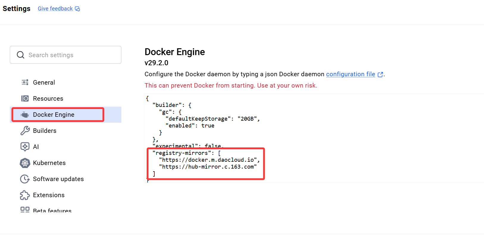 选择Docker Engine,在其中配置Docker的镜像
