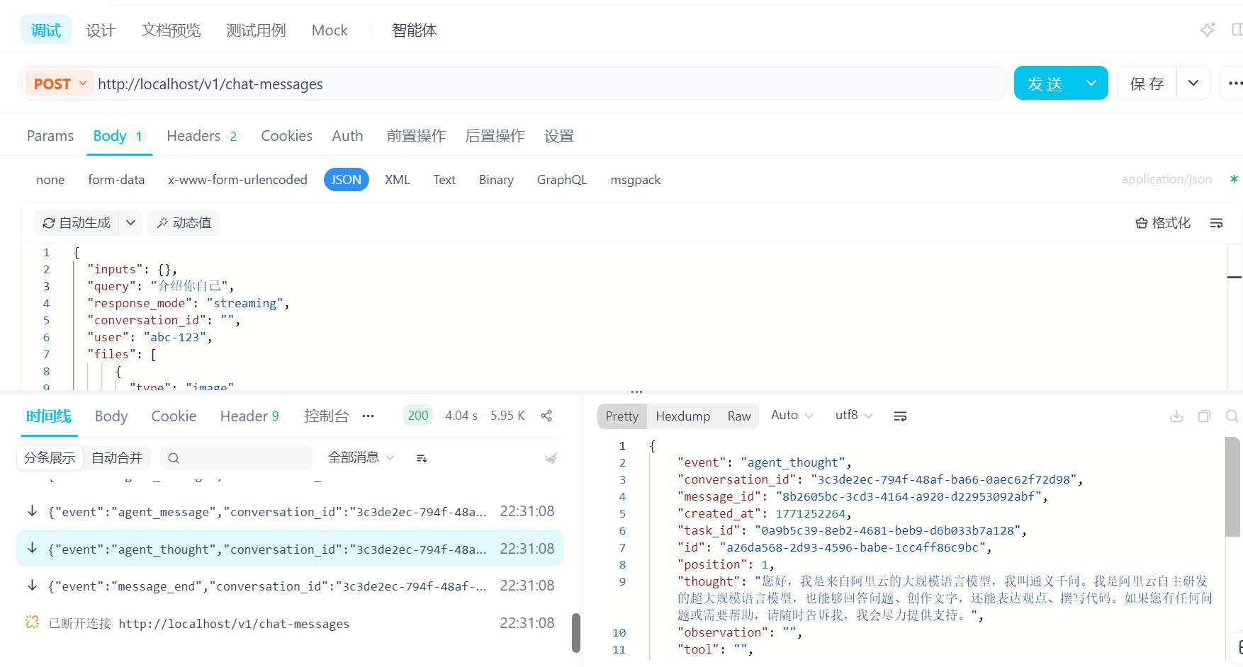将相关参数修改后就能使用了,query为用户提问,效果如图