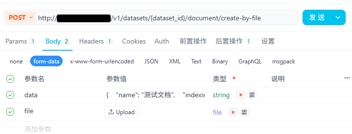 curl –location –request POST ‘http://xxx/v1/datasets/知识库id/document/create-by-file'; –header ’Authorization: Bearer dataset-hzKxz6vnM21UqRQtL0FLppiu‘ –form ’data=“{