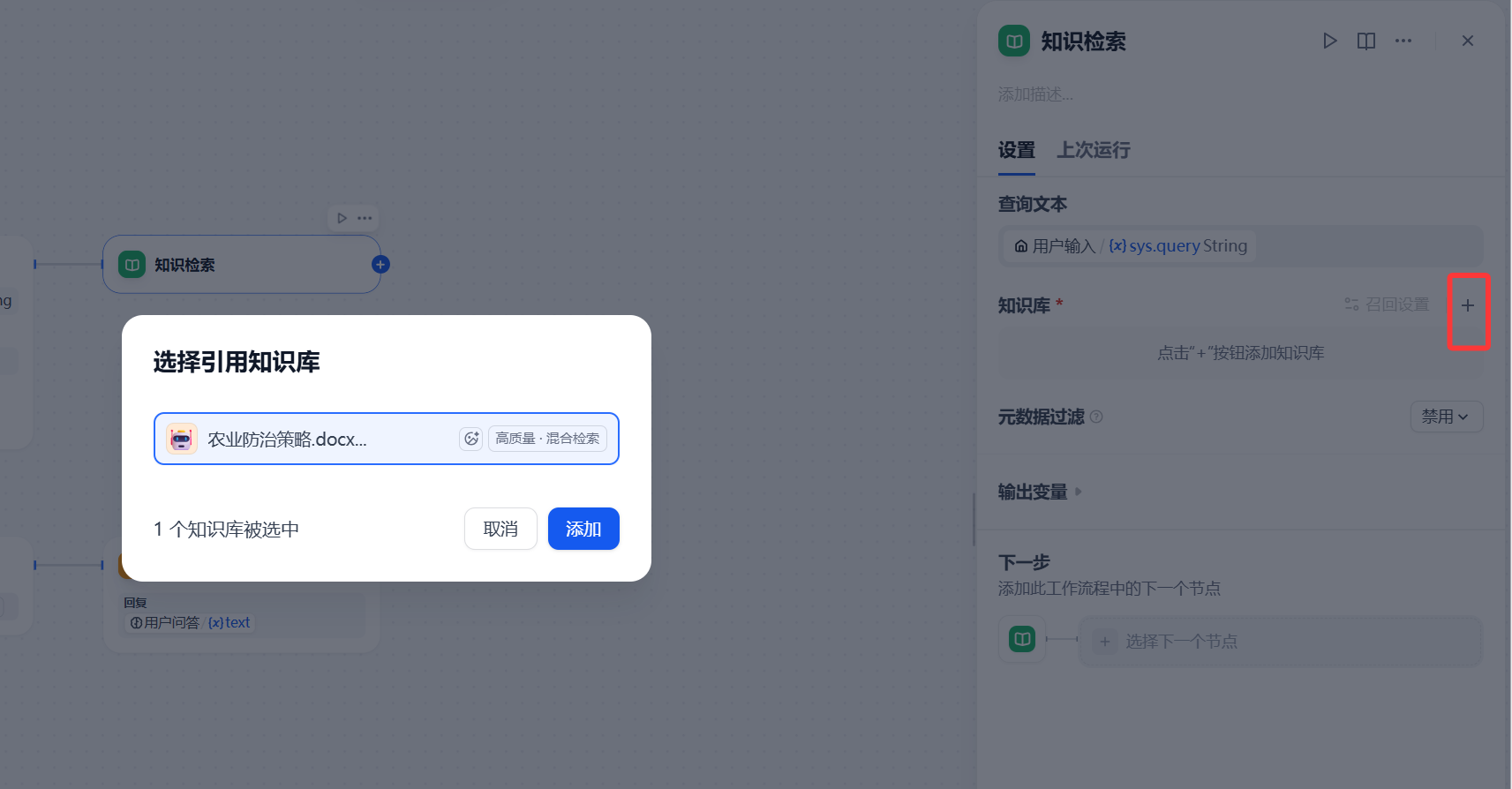 在Agent后添加 知识检索 节点,添加所需要的引用知识库