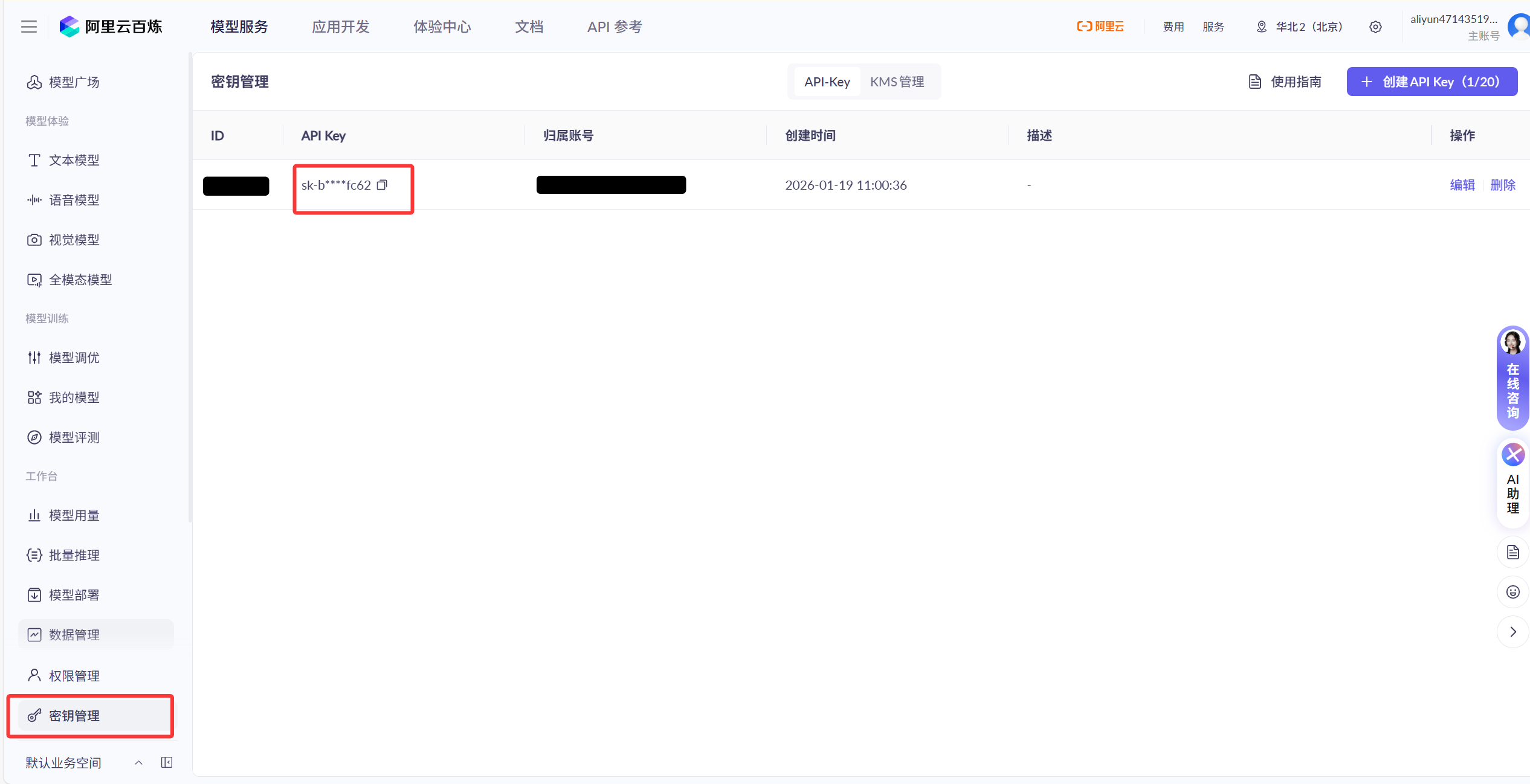 选择密钥管理,创建API Key,并复制(记得开启:免费额度用完即停)
