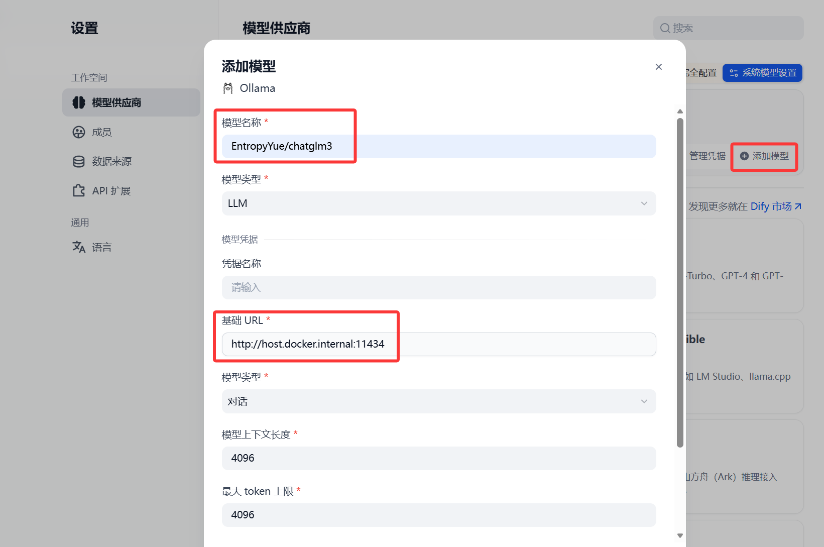 下载好ollama后选择 添加模型,模型名称处要与ollama下载时的名称一致,基础url即为Ollama指定的API地址