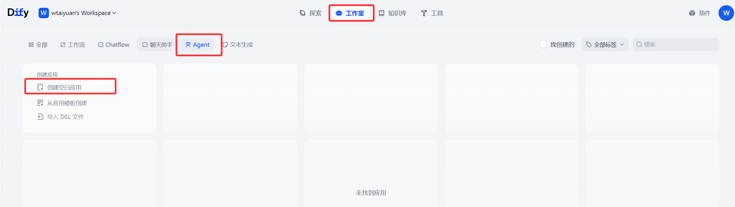 将模型配置好后(本地/API任选其一),我们开始在Dify中创建Agent智能体应用,回到Dify首页,点击Agent(如果直接在全部中创建不会显示agent和聊天助手选项),点击创建空白应用
