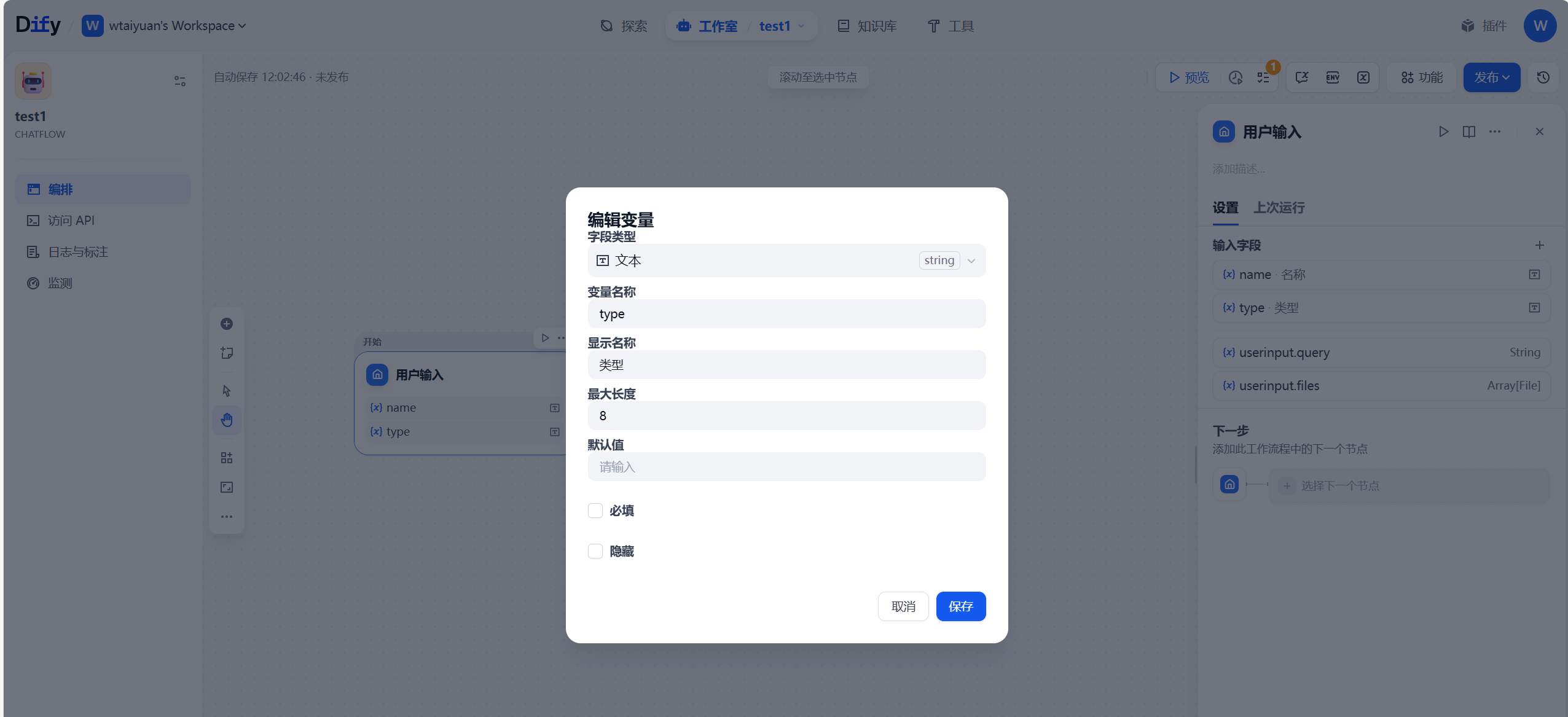 现在博主要编排一个功能包括病虫害防治/生长预测和建议/用户问答功能的工作流,实现在用户输入处编写一些变量,name表示病虫害/作物名称,type表示当前类型(用于判断是防治还是生长),相关参数如下