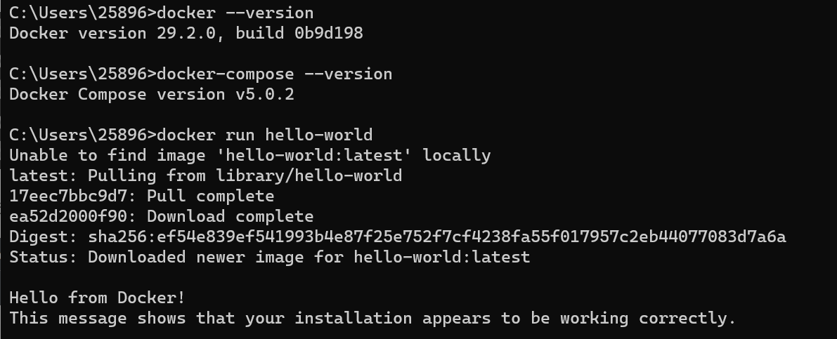 # docker版本 docker --version # docker compose版本 docker-compose --version # 测试运行 docker run hello-world