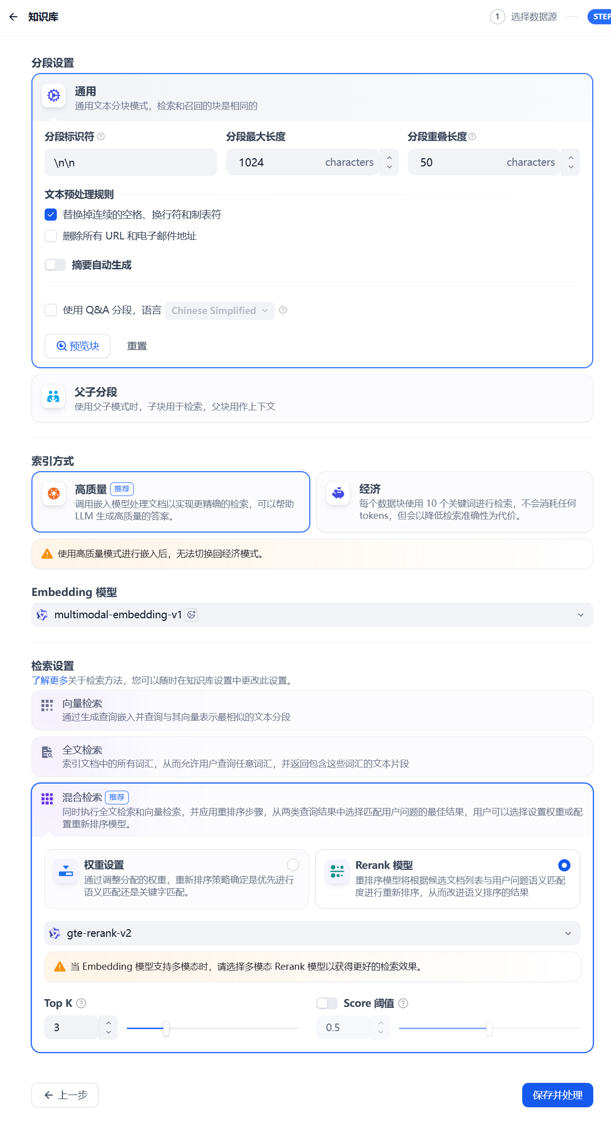 对文本进行分段与清洗,选择自己所需参数,其中Top K标识对在排名前x名的数据进行引用,Score阈值则为当大于该阈值的才进入筛选进行排名引用,保存并处理