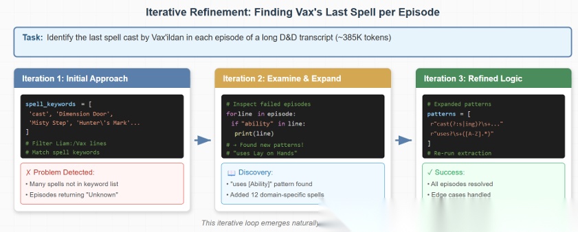 Oolong-Real 上的迭代优化示例。当被要求在一份 38.5 万 token 的转录文本中找出 Vax’ildan 在每一集中施展的最后一个咒语时,编码代理编写了 Python 脚本,并通过分析失败案例发现了领域特有的咒语表述方式,随后不断迭代改进其处理逻辑。