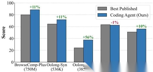 编码智能体在五个长上下文基准测试中显著超越此前**公开结果,这些基准的上下文长度跨度从188K到三万亿token。