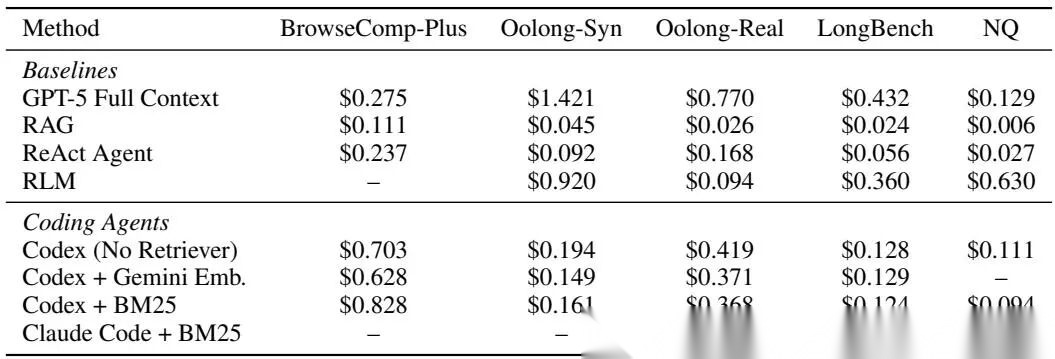 编码代理虽然高于轻量 RAG,但显著低于 GPT-5 全上下文与 RLM 等强基线,整体性价比更优。以 Oolong-Real 为例: