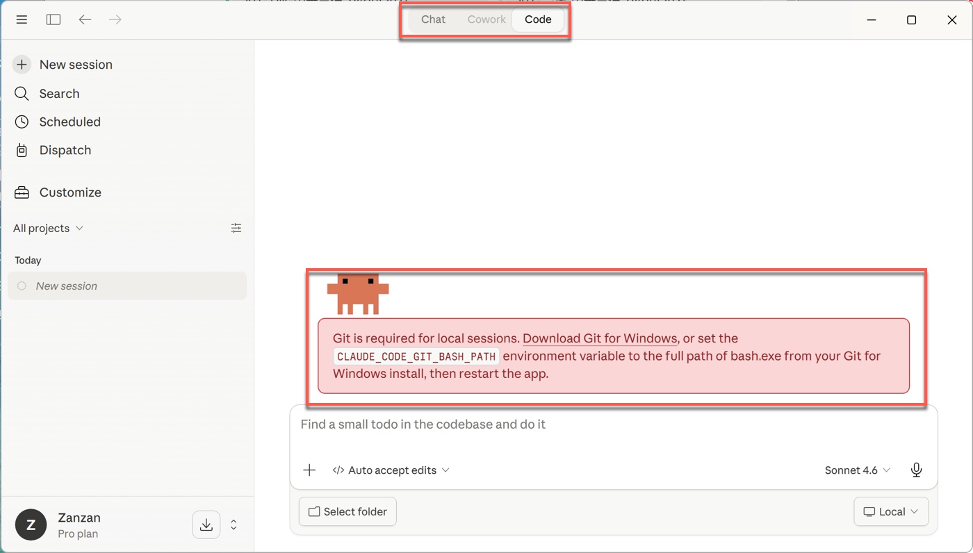 打開Claude Code準備開始工作,畫面跳出紅色警告框,提示「Git is required for local sessions(本機工作階段需要Git)」,下方說明可以下載Git for Windows,或是設定「CLAUDE_CODE_GIT_BASH_PATH」環境變數來解決。第一次看到這個畫面,多數人的直覺是「我可能沒裝Git」,但更精準的問題其實是系統無法正確呼叫Git所附帶的shell環境,例如Git Bash。
