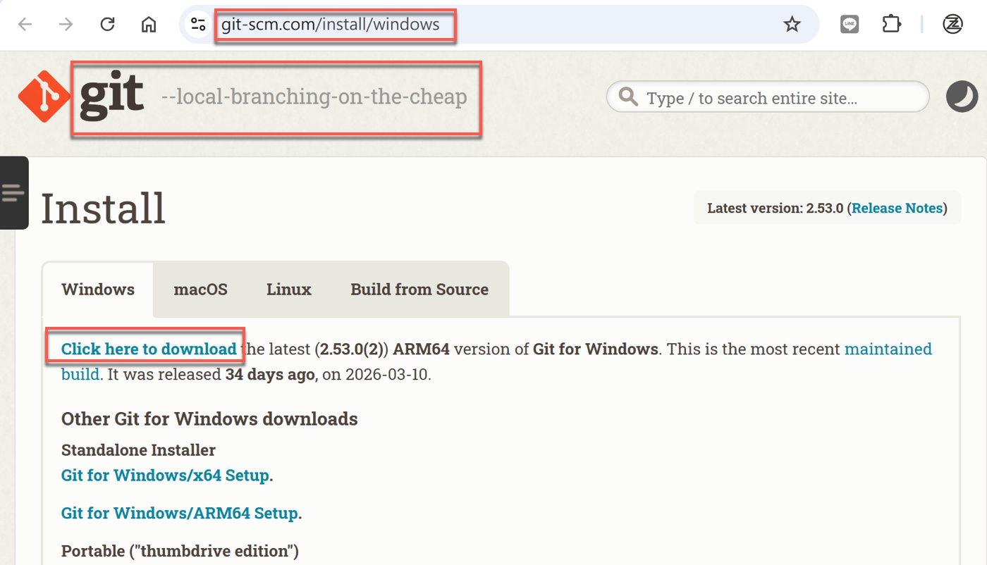 進入瀏覽器,前往「git-scm.com」這個Git官方下載網站,頁面會自動偵測作業系統,顯示「Click here to download(點此下載)」按鈕,並標示目前最新版本的安裝檔。本次畫面顯示的是適用於ARM64架構Windows系統的版本,如果你的電腦是一般Intel或AMD的x64處理器,頁面則會顯示x64版本,直接點擊下載即可。