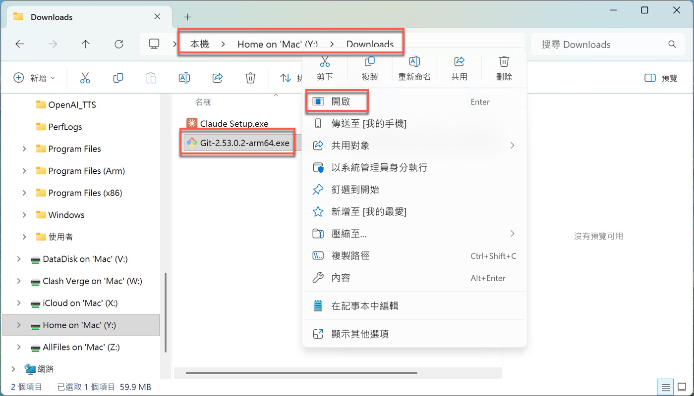 回到Windows的「Downloads(下載)」資料夾,可以看到剛才下載好的Git安裝檔,大小約59.9 MB。對著這個.exe檔按右鍵,選擇「開啟(Open)」或「以系統管理員身分執行(Run as administrator)」,啟動安裝程式。