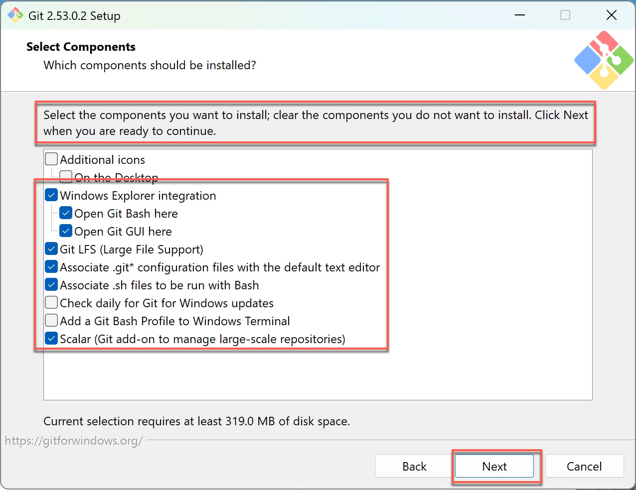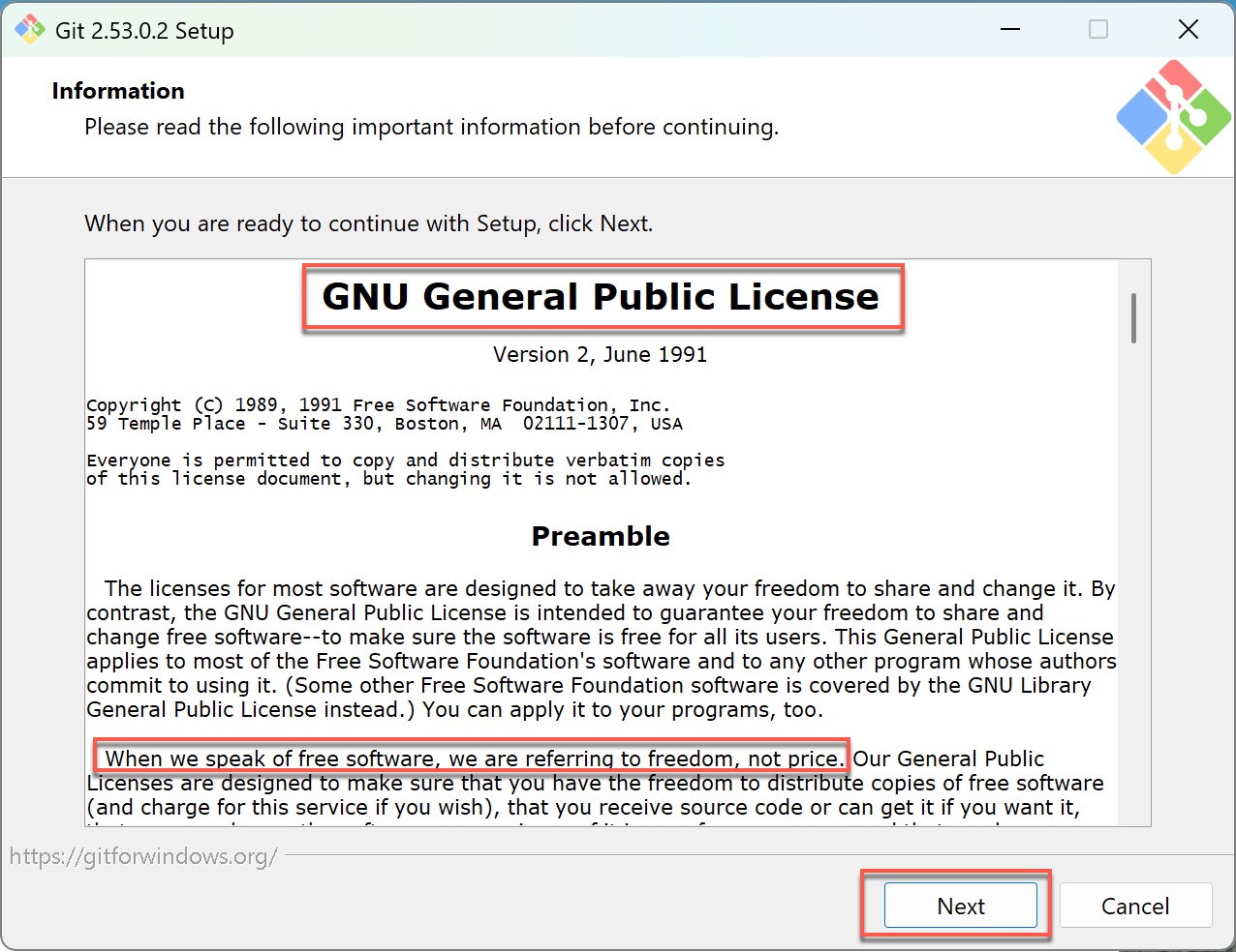 GPL是全球最重要的開源授權之一,核心在於保障任何人都有使用、研究、修改與散布軟體的自由。Git採用GPL授權,代表原始碼可以被檢視與自由使用,這也是它能長期成為全球開發基礎工具的重要原因之一,不會被單一商業利益綁住。雖然這個畫面只需要按Next就能跳過,但背後代表的開源精神,其實是整個現代開發生態能運作的關鍵基礎。