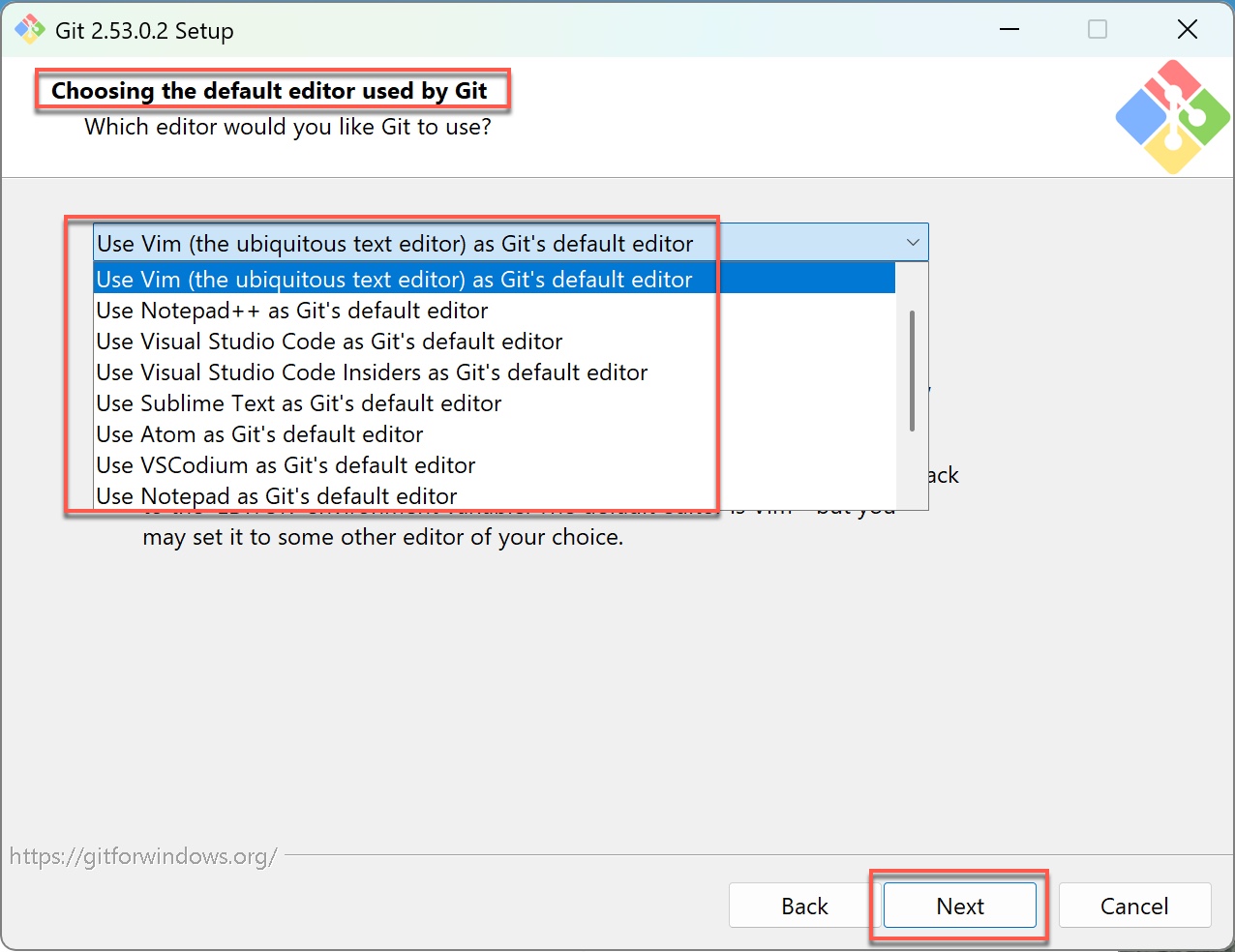 安裝流程來到「Choosing the default editor used by Git(選擇Git預設使用的文字編輯器)」這一步,下拉選單中包含Vim、Notepad++、Visual Studio Code、Notepad等選項,預設為Vim。這個設定影響的是當Git需要你手動輸入內容時,例如撰寫提交紀錄,會自動開啟哪一個編輯器。確認後按「Next(下一步)」繼續。