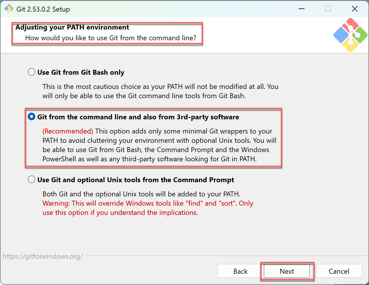 三個選項的差異在於Git能被哪些環境使用。選第一個,Git只存在於Git Bash,CMD、PowerShell與Claude Code等工具都無法使用,等同問題不會被解決。選第三個,會把大量Unix工具加入Windows路徑,可能影響原本系統指令,屬於進階用法。第二個選項是最平衡的做法,讓Git能被命令列與第三方工具正常呼叫,又不會干擾系統原本設定。這一步設定正確,通常可以解決大多數「找不到Git」的問題,也是Claude Code能順利運作的關鍵。