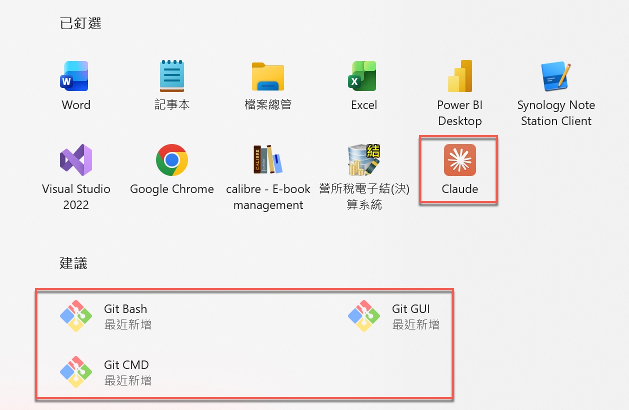 安裝完成後,打開Windows開始功能表,在「最近新增」中會看到三個工具:「Git Bash」、「Git GUI」與「Git CMD」,代表Git環境已成功建立。Git Bash提供Linux風格終端機,Git CMD對應Windows命令提示字元,而Git GUI則提供圖形化操作介面,可以依照使用習慣選擇。