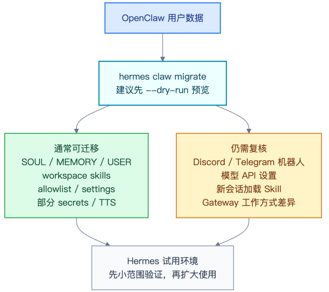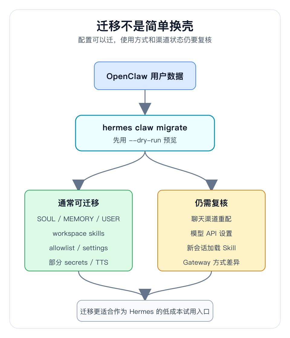 - • 迁移能做,但更像低成本试用入口。 Hermes 支持
