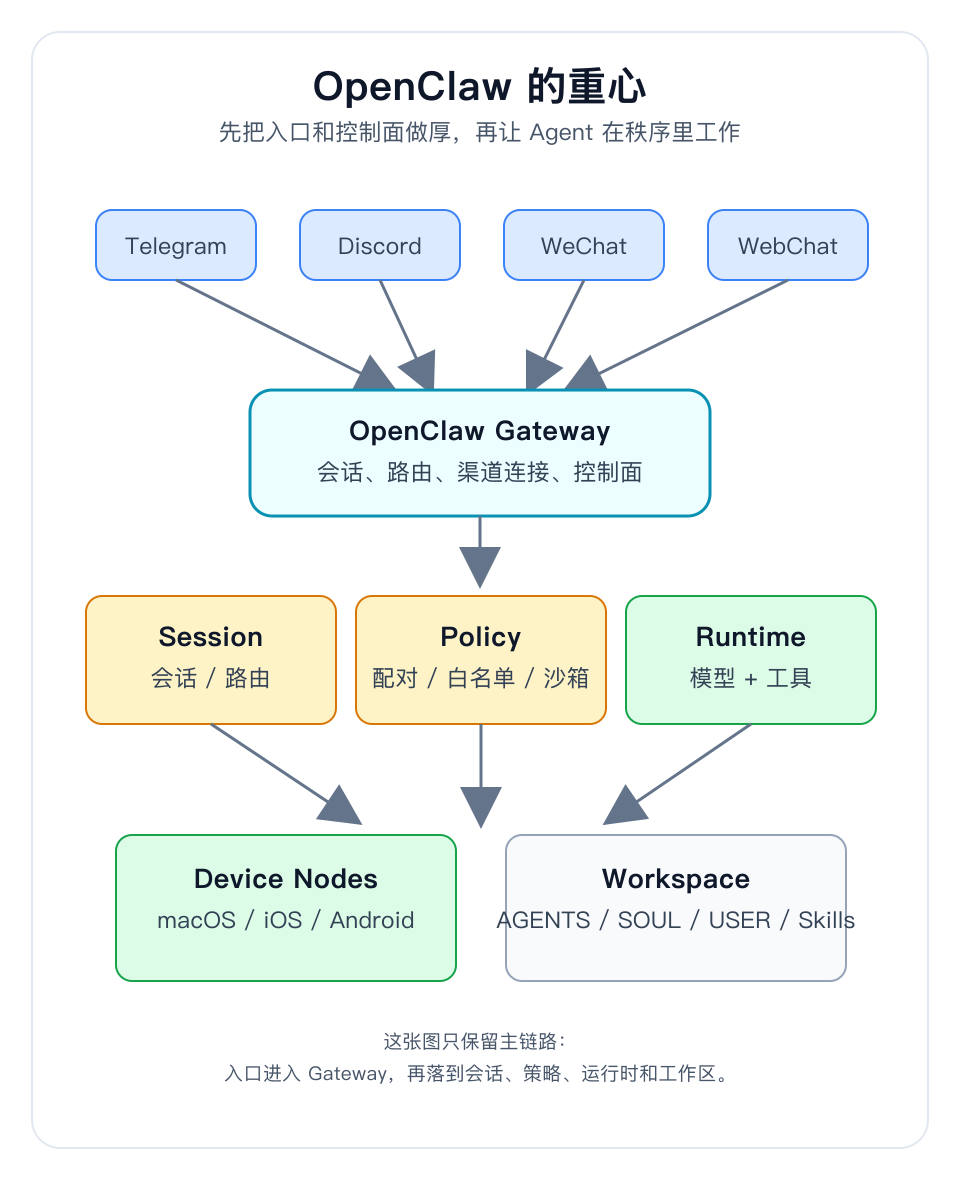 看 OpenClaw,就看它的 Gateway、渠道、会话和设备治理有没有让你的 Agent 更容易进入日常场景。
