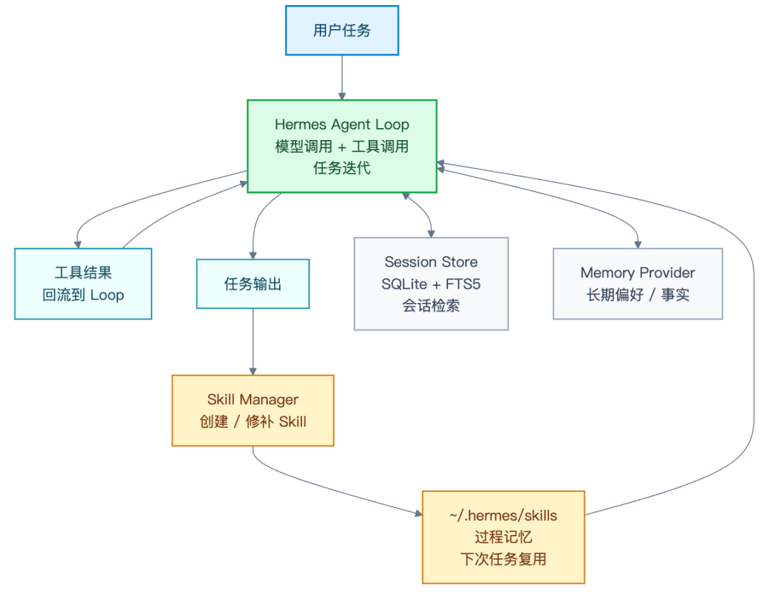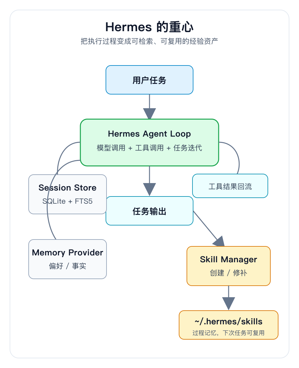 本文只抓和 OpenClaw 对比最相关的一点:Hermes 把 Agent 的执行过程当成长期资产。