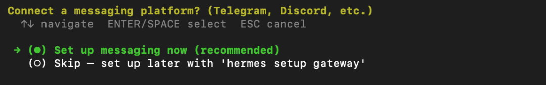 如果你暂时不想设置,也可以先跳过,之后再调用「hermes setup gateway」这个命令。