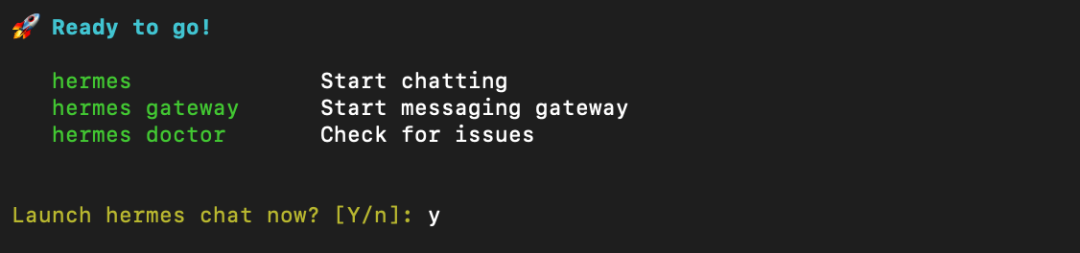 之后在终端里输入「hermes」,就可以开启与智能体的对话。