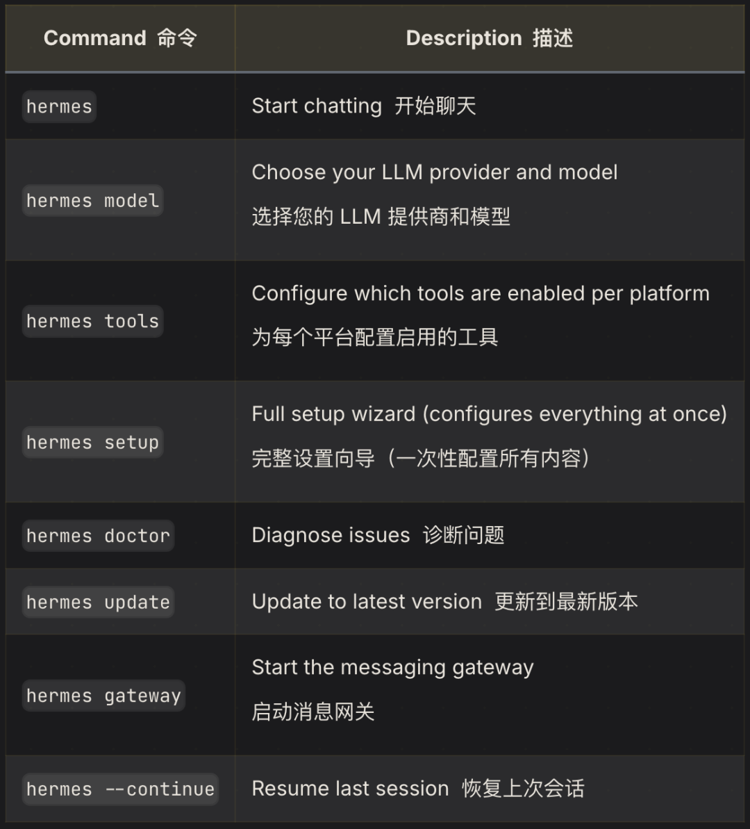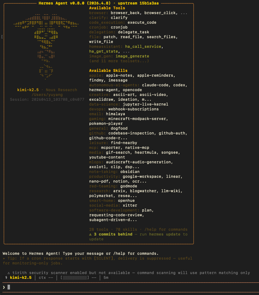 不必担心环境问题,什么Python、Node.js,缺了啥Hermes Agent都会自己帮你装好。