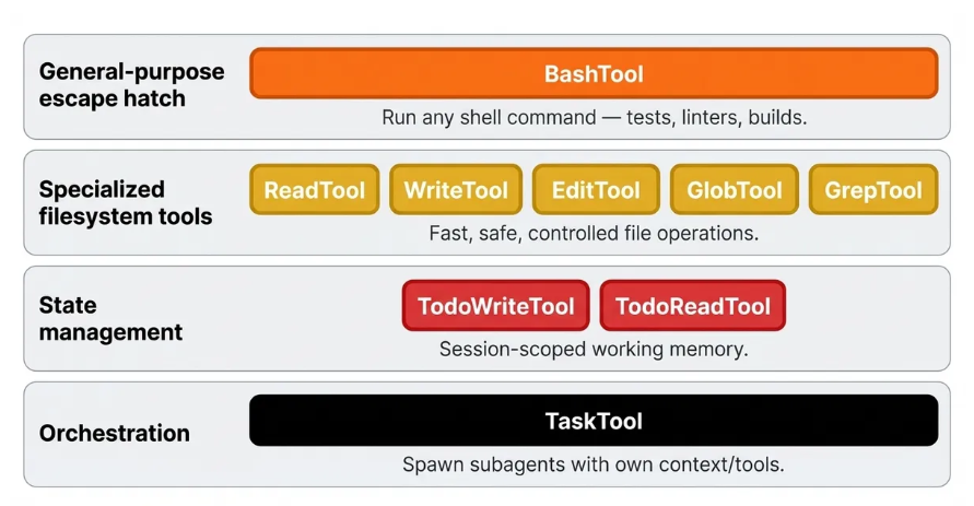 - • 通用bash工具:执行终端指令,跑测试、编代码,灵活度拉满;