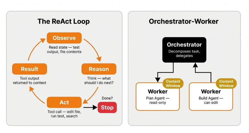 核心是ReAct模式(推理+行动):模型读取当前状态→推理下一步操作→调用工具执行→接收反馈→循环直至完成任务。
