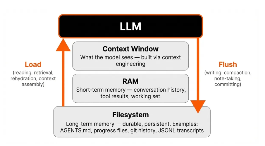 - • 上下文窗口(可视记忆):模型能看到的信息,通过压缩、按需加载适配窗口限制。
