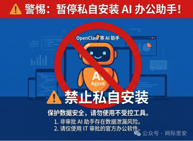 面对如此诱人但又充满陷阱的新技术,网际思安建议:在现阶段安全机制尚未完全成熟之前,企业不应建议、甚至应严格限制员工在办公终端安装OpenClaw等类似的AI助手。