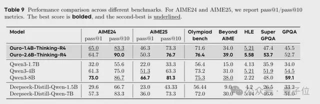 测试结果,1.4B的Ouro模型性能对标约4B的传统模型。2.8B的Ouro模型相当于8B–12B的传统模型。