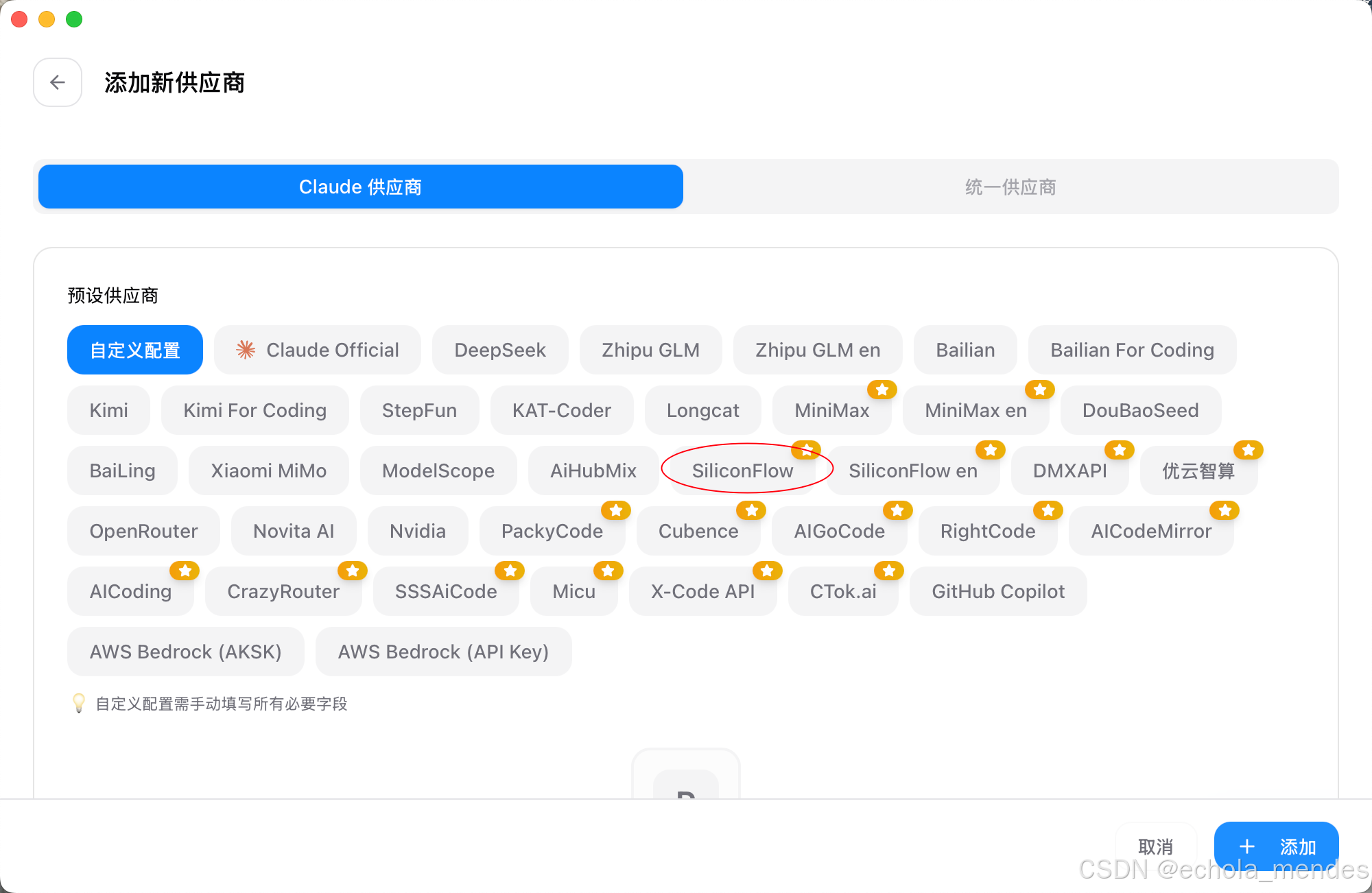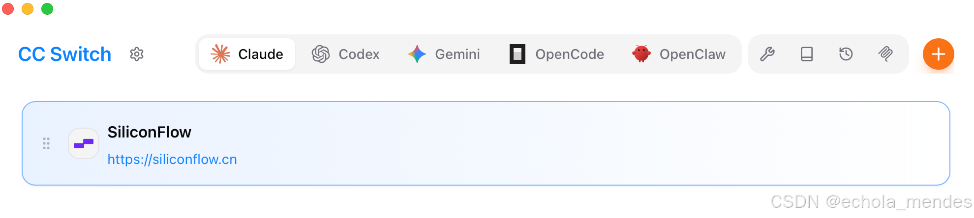 CC Switch安装完成后,就是如下页面,点击右上角的“+”,配置硅基流动SiliconFlow供应商,往下滑配置API Key