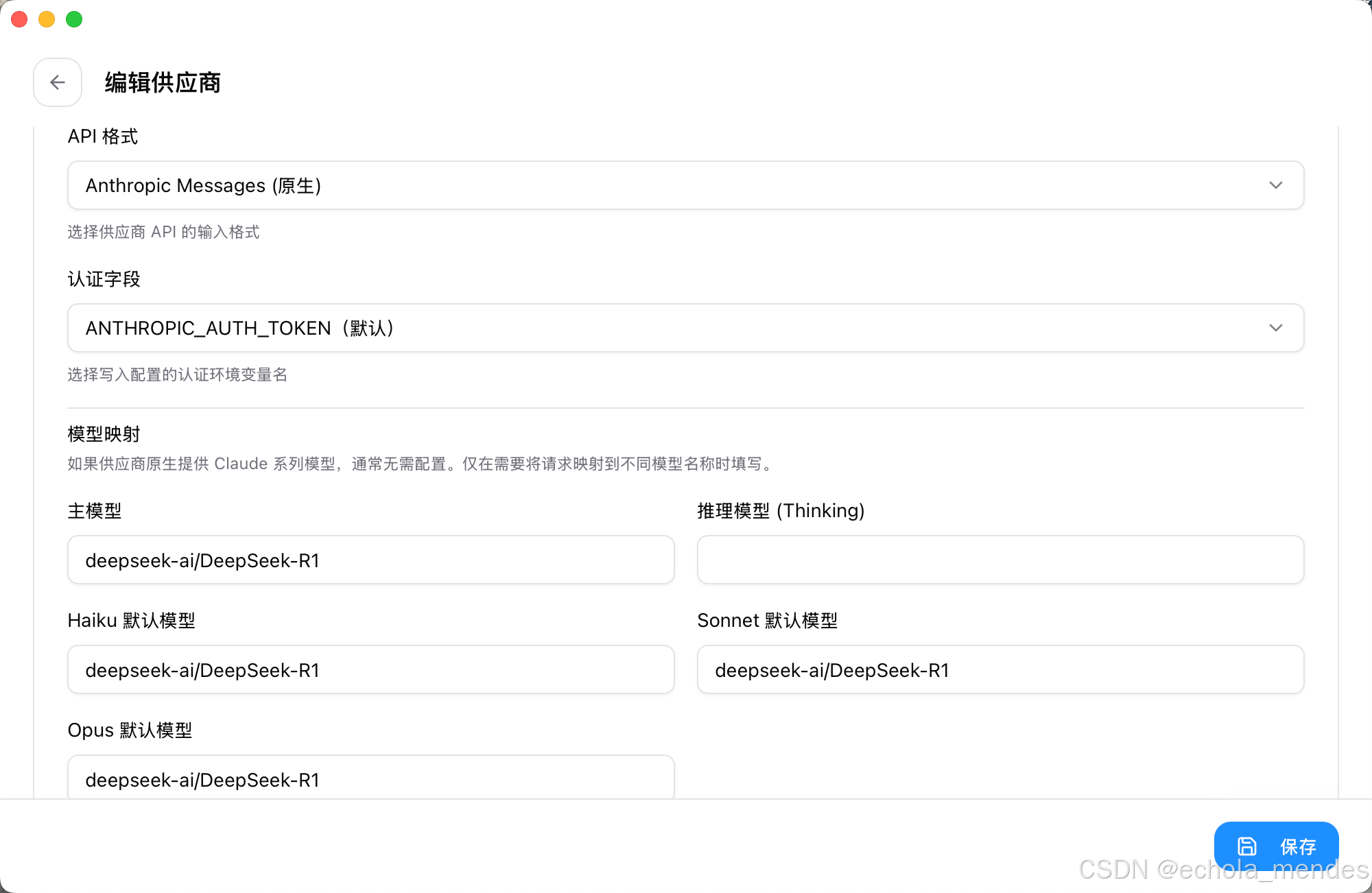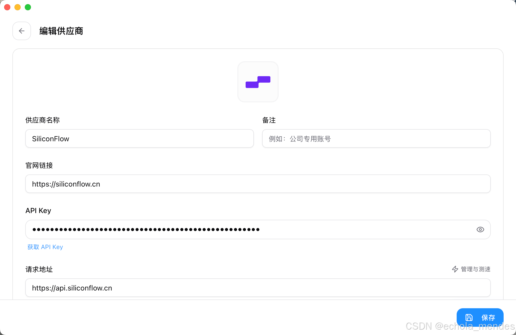 将硅基流动的API Key添加到CC Switch的API Key中,完成如下配置,关于模型选择可以在硅基流动的模型广场选择,或者默认模型也可