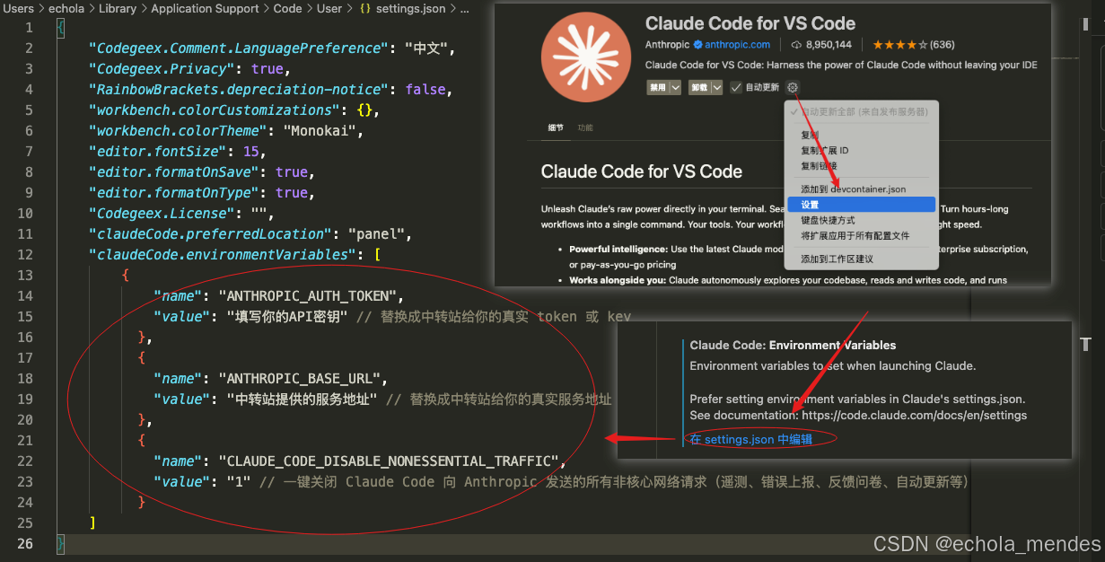 "claudeCode.environmentVariables": [ { "name": "ANTHROPIC_AUTH_TOKEN", "value": "填写你的API密钥" // 替换成中转站给你的真实 token 或 key }, { "name": "ANTHROPIC_BASE_URL", "value": "中转站提供的服务地址" // 替换成中转站给你的真实服务地址 }, { "name": "CLAUDE_CODE_DISABLE_NONESSENTIAL_TRAFFIC", "value": "1" // 一键关闭 Claude Code 向 Anthropic 发送的所有非核心网络请求(遥测、错误上报、反馈问卷、自动更新等),让运行更隐私、更干净、更少的后台流量 } ]
