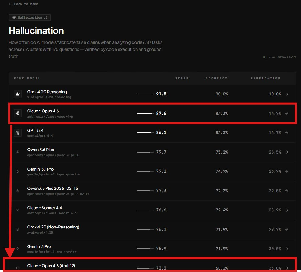 而在今天,Claude降智似乎被实锤了,claude opus4.6 推理水平被削弱了,幻觉基准测试从 83.3% 降到了 68.3%。