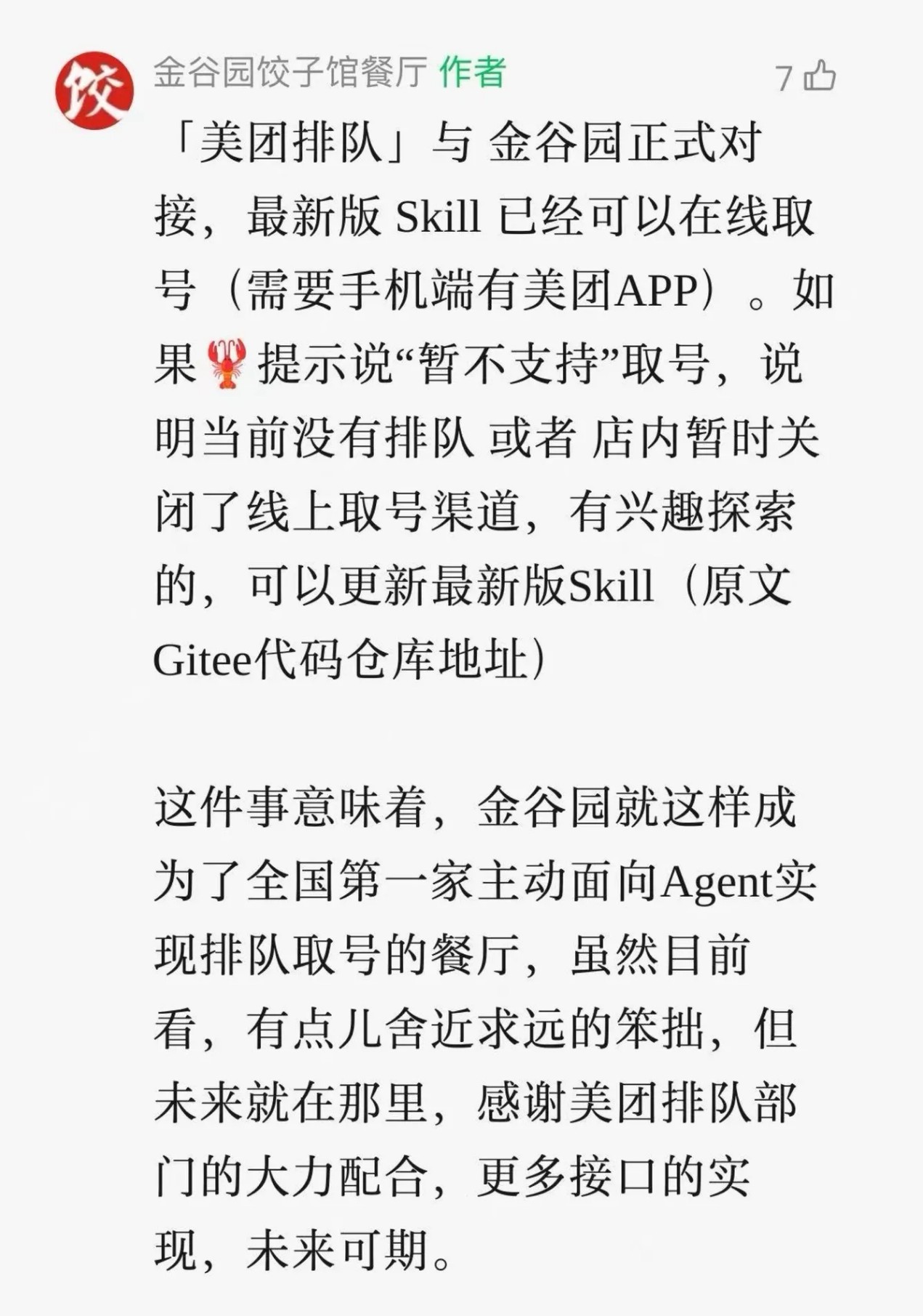 金谷园饺子馆公众号最新消息显示,美团排队与金谷园正式对接,最新版Skill已经可以在线取号,这也意味着,金谷园已成为全国第一家主动面向Agent实现排队取号的餐厅。