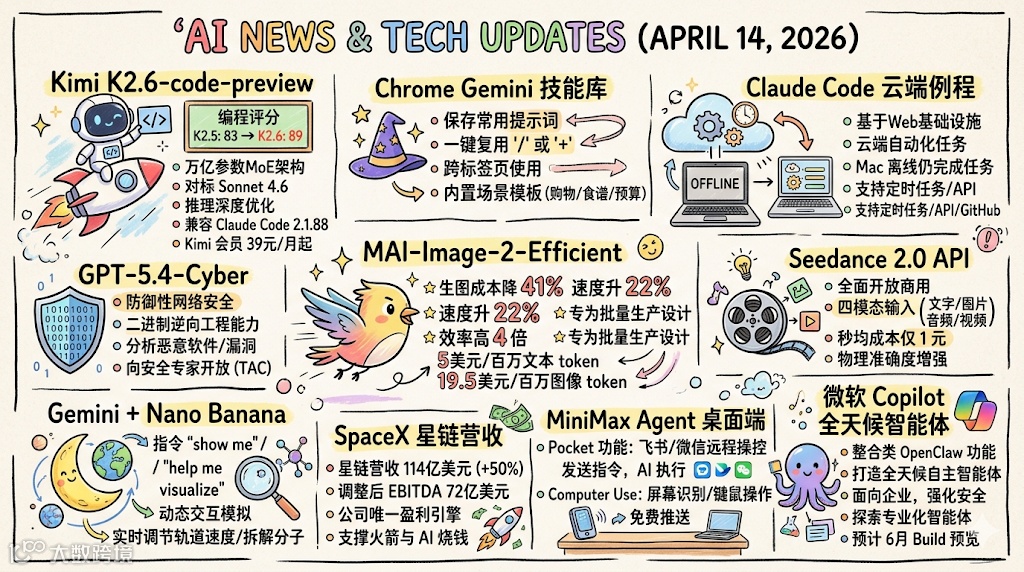 4 月 14 日,微软推出 MAI-Image-2-Efficient 轻量模型,作为 MAI-Image-2 的优化版,生成速度提升 22%、效率提高 4 倍、成本降低 41%,较竞品模型快约 40%。定价:每百万文本输入 token 5 美元,图像输出 token 19.5 美元;已在 Microsoft Foundry 和 MAI Playground 开放预览,专注产品实拍与 UI 原型生成。
