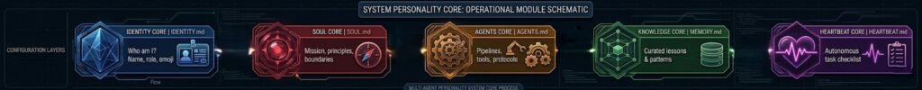 每个智能体的身份都存储在Markdown文件中。没有代码,没有数据库架构,没有配置YAML文件。只有结构化的文本,智能体在每次会话开始时都会读取这些文本。