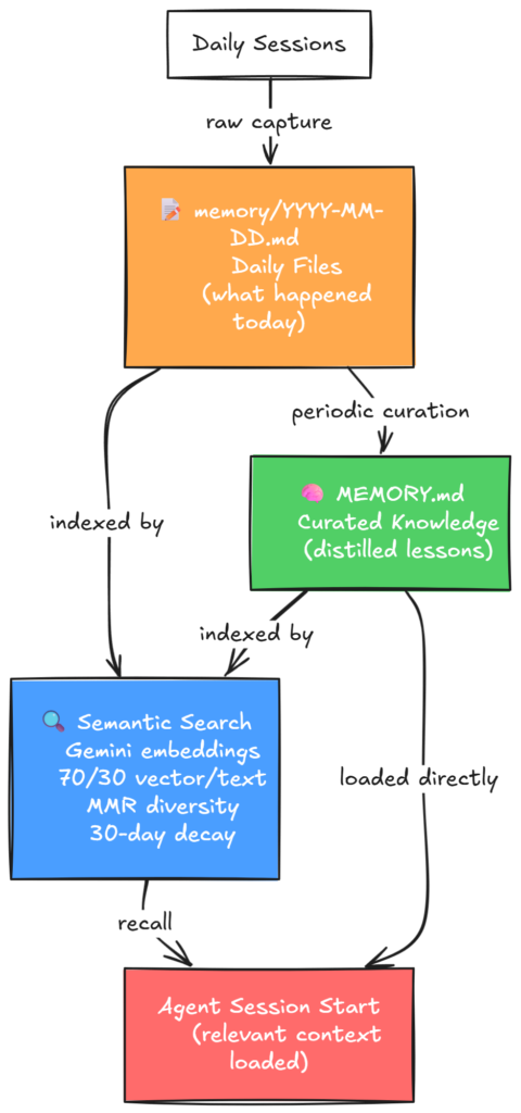 记忆是一个系统,不是一个文件。单一的记忆文件无法扩展。你需要原始记录(每日文件)、精选参考(MEMORY.md),以及对所有内容的语义搜索。整理步骤是形成机构知识的关键。我知道,随着系统的继续增长,我将不得不增强这个系统,但这已经是一个很好的基础。
