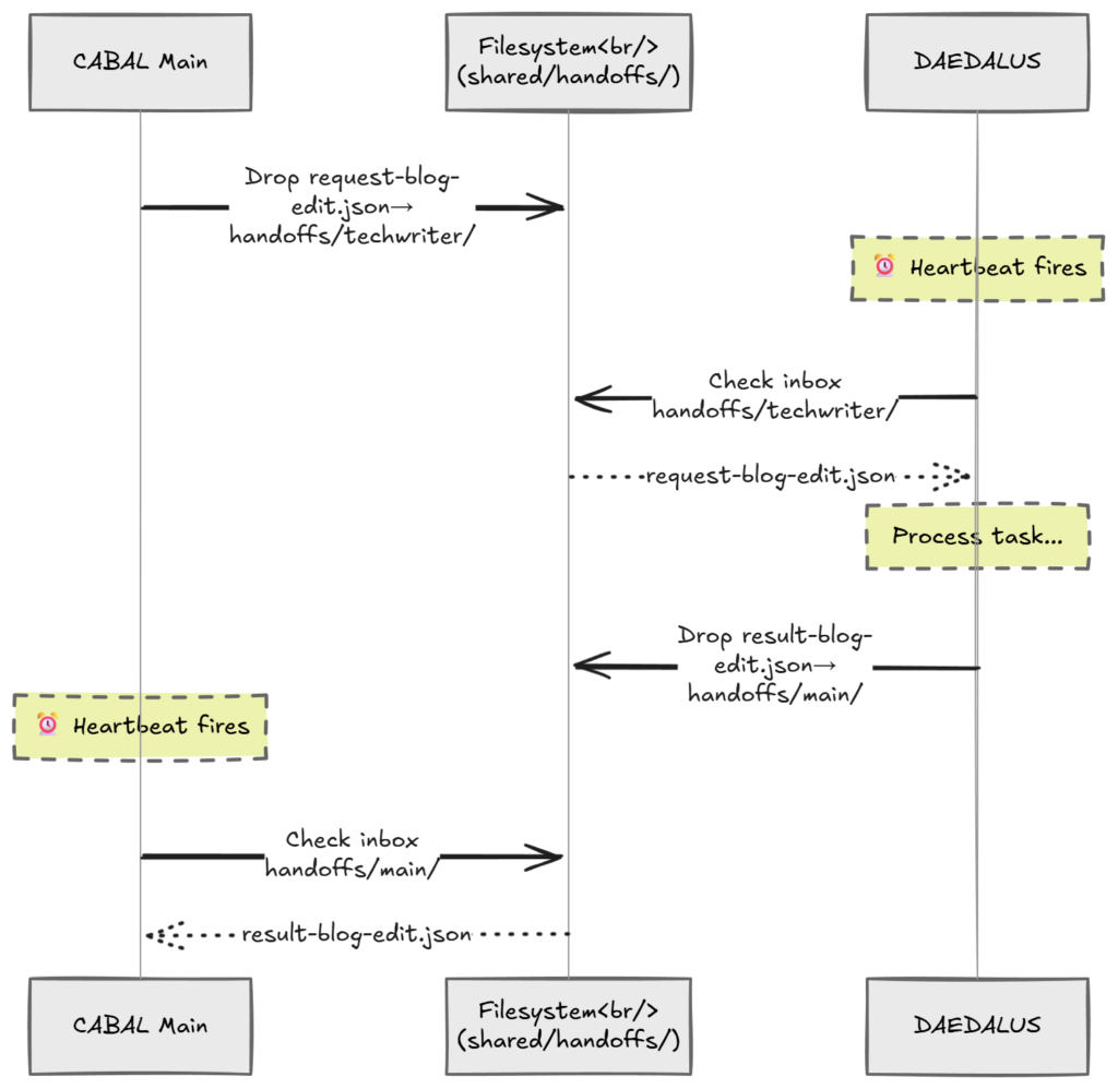 智能体通过目录进行通信。每个智能体在 shared/handoffs/{agent-name}/ 路径下都有一个收件箱。上游智能体将一个JSON文件放入收件箱,下游智能体在下次心跳检测时拾取该文件,处理完成后,将结果放入发送方的收件箱。这就是完整的协议。